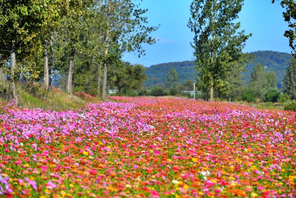 포토존 표지판이 있는 구역은 대기열이 생기기도 하는데, 조금만 벗어나면 비슷한 구도와 색감을 얻을 수 있는 ‘세컨드 스폿’이 꼭 있습니다. 특히 산책로와 꽃밭이 만나는 S자 코너, 나무 그늘이 드리운 초입, 벤치 근처의 낮은 울타리 옆은 사람이 적으면서도 화면이 깔끔하게 떨어집니다. 코스모스 구간에서는 바람 방향을 등지게 서서 꽃대가 한쪽으로 기울 때 셔터를 누르면, 배경 전체가 흐르는 듯한 느낌을 살릴 수 있습니다.