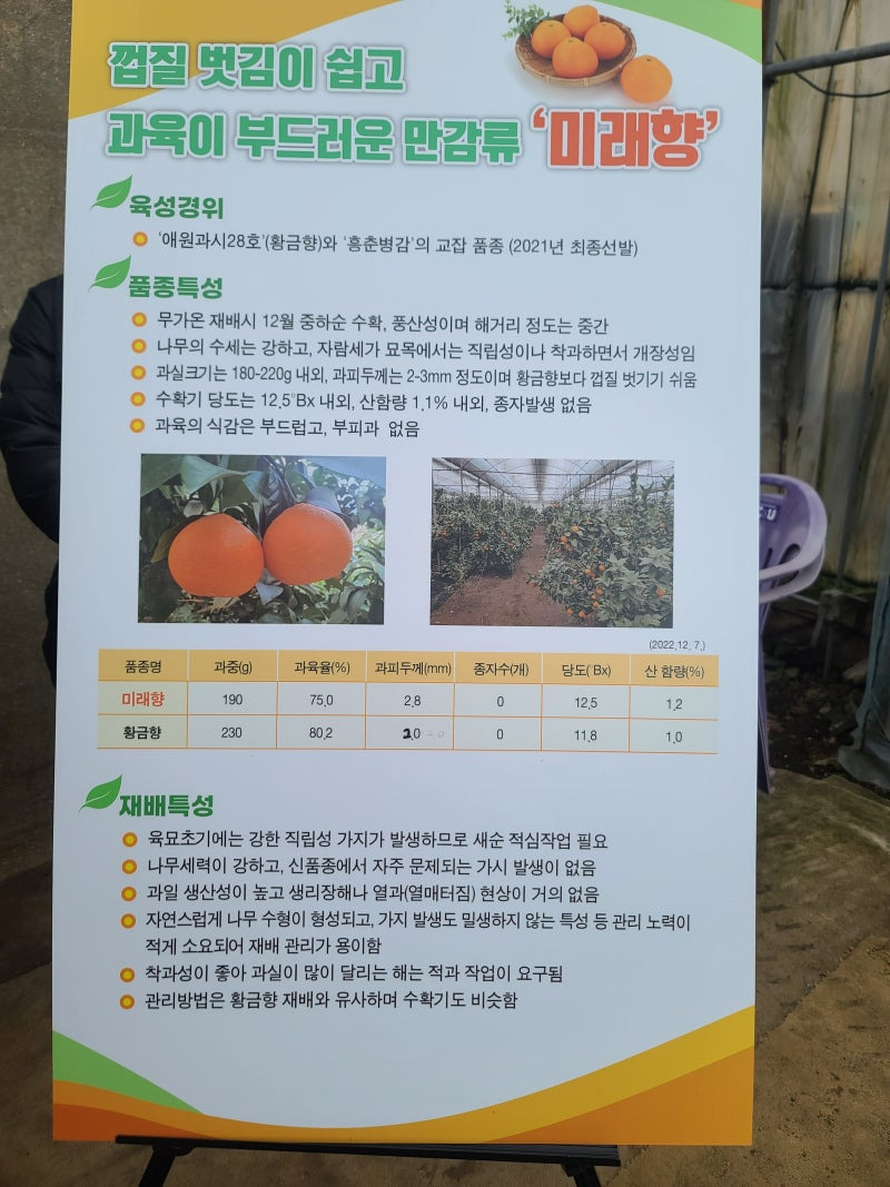 겉모양도 빼놓을 수 없어요. 직립성 나무에 수세가 강해 착과가 좋고, 붉은 껍질 색이 매력적이라 선물용으로 딱! 같은 기간 황금향보다 당도와 향, 풍미에서 우수하다는 현장 평가가 나왔어요. 해를 넘기지 않고 12월 중하순에 무가온 재배로 수확 가능해 신선함이 그대로 전달되죠. 먹기 편하고 맛있는 미래향, 한 번 맛보시면 기존 감귤과 비교가 안 될 거예요.