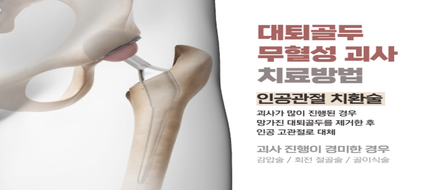 💡 ‘대퇴골두 무혈성 괴사’는 대퇴골(허벅지 뼈) 머리에 피가 통하지 않아 뼈조직이 점차 죽는 질환입니다. 40~50대 남성에서 많이 발병하며, 치료가 늦을 경우 인공관절치환술까지 필요할 수 있습니다.