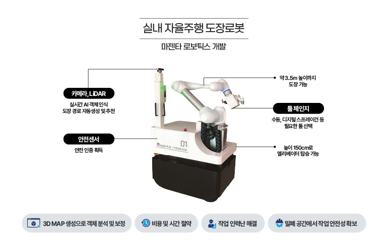 무인 도장 시스템의 3대 핵심은 인지(Perception)→판단(Decision)→행동(Action)입니다. 롤롯은 외벽 표면을 센서로 정밀 인지하고, 도장 횟수·두께를 자동 판단하며, 일관된 속도로 페인트를 바르는 방식입니다. 이로 인해 인간의 개입 없이도 균일한 품질의 시공이 가능해집니다. 또한, 피지컬 AI(물리적 인공지능) 기술이 접목되어, 복잡한 현장 환경에 적응하며 스스로 판단하는 능력도 갖추고 있습니다.