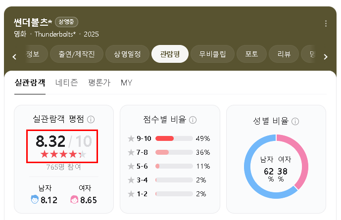 '썬더볼츠'는 화려한 액션보다 안티히어로들의 심리적 갈등과 팀워크, 치유를 강조한 작품으로, "마블의 새로운 방향성"을 제시했다는 평가를 받고 있습니다. 관람객 리뷰를 종합한 결과, 평점은 대략 10점 만점에 7~9점 수준으로 "최근 MCU 작품 중 가장 나은 수작"이라는 평가가 주를 이룹니다.