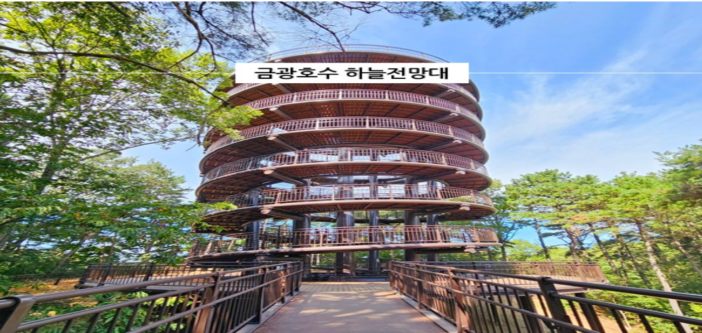 금광호수 하늘전망대는 2024년 9월 정식 개방 이후 안성 여행의 핵심 명소로 자리 잡았습니다. 높이 25m, 나선형 구조로 설계되어 누구나 안전하게 오를 수 있습니다. 주차장에서 약 500~700m 정도 산책로를 걸으며, 흙길과 숲길이 어우러져 자연의 향기를 그대로 느낄 수 있습니다.