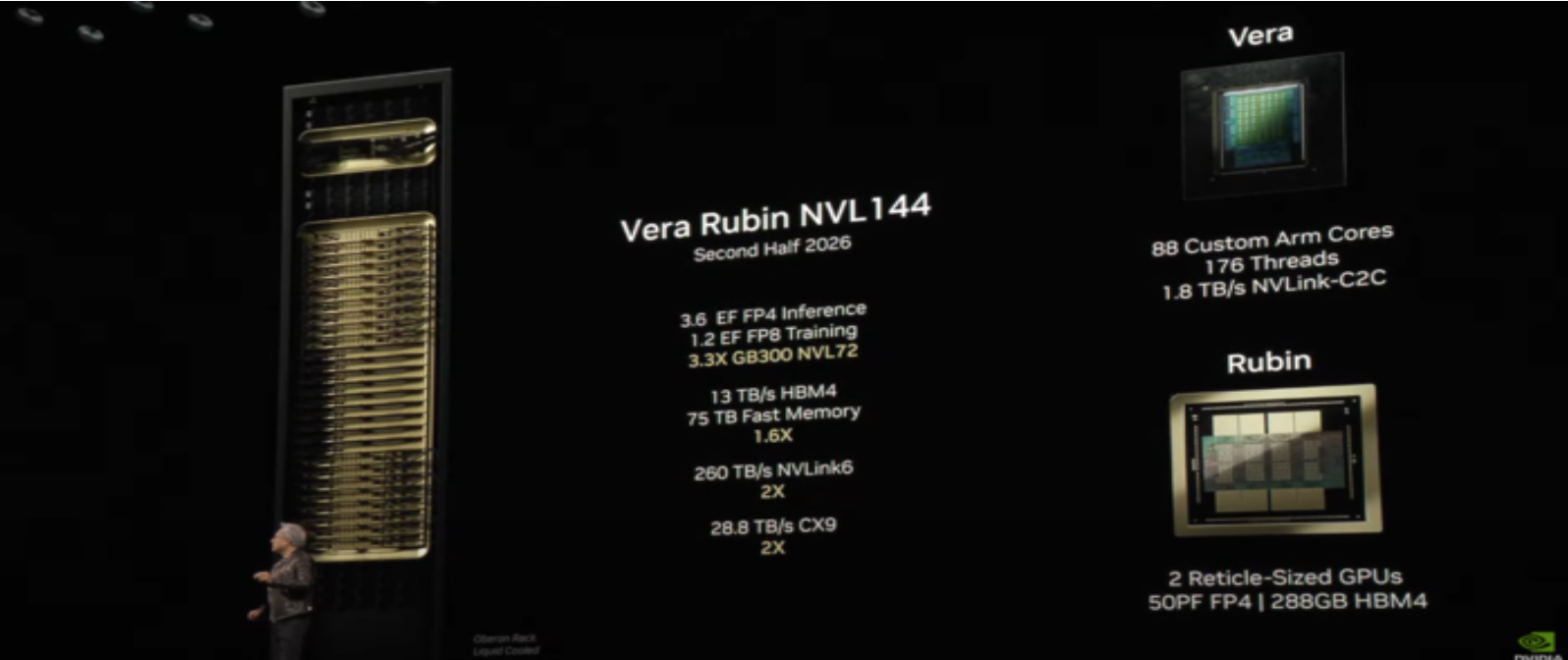 "2027년까지 600kW 랙으로 7.5배의 성능을 제공하는 NVIDIA Vera Rubin은 커스텀 CPU, 128GB 메모리, 액체 냉각으로 AI 인프라를 재정의하는 배포를 선보일 것입니다."