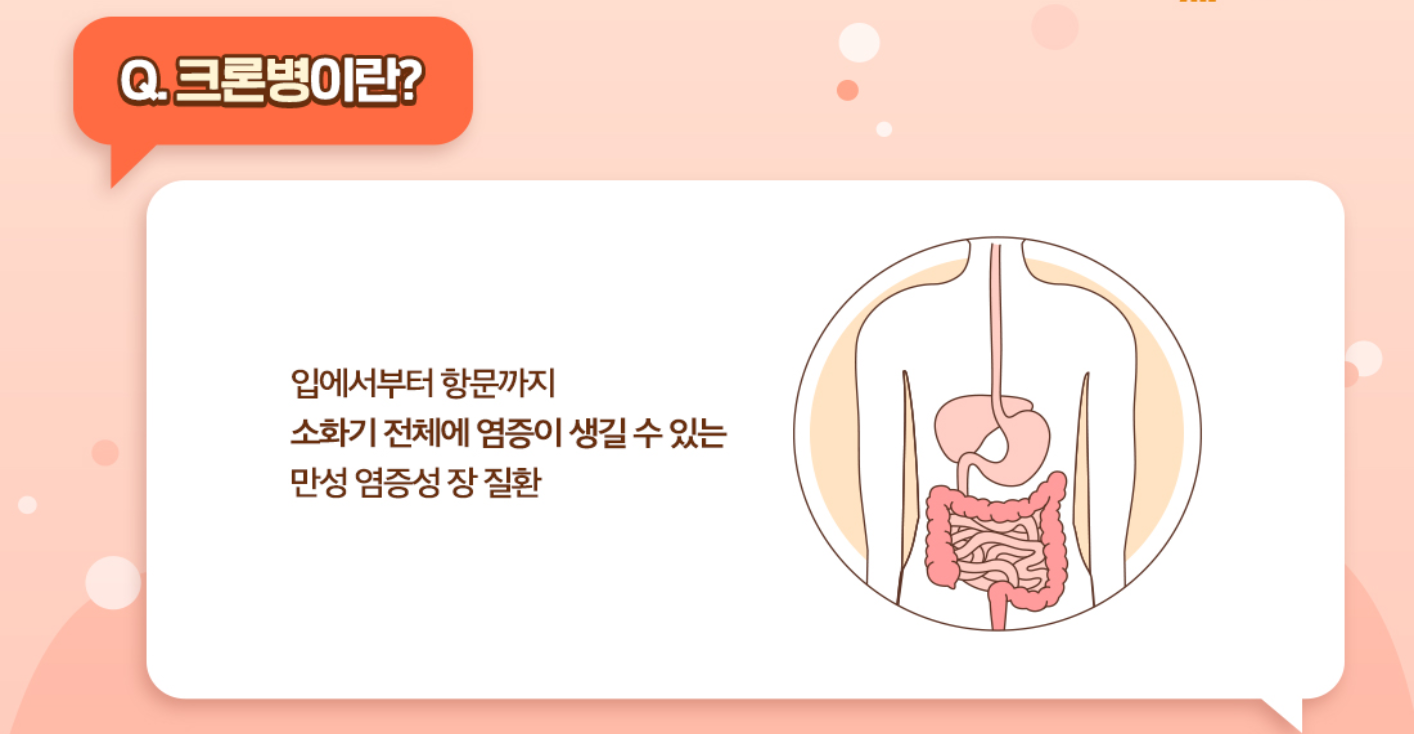 💡 크론병은 소화관의 어느 부위에서나 발생하는 만성 염증성 장질환으로, 주로 20-30대 젊은 층에서 발병률이 높은 질환입니다.