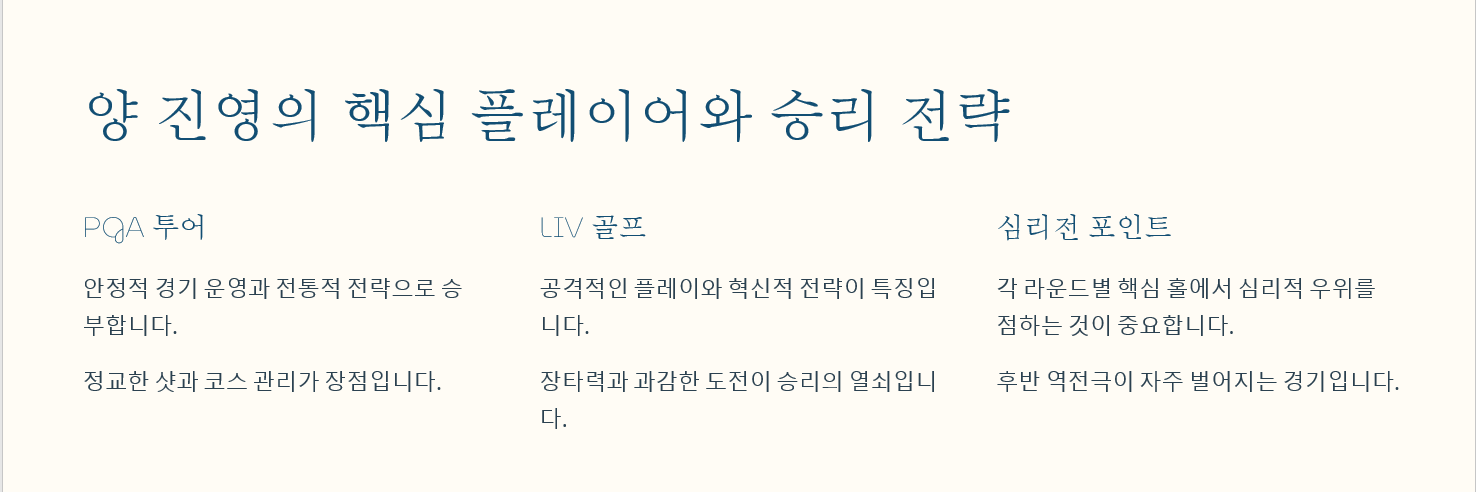 이번 대회는 단순한 개인 우승을 넘어 두 진영 간의 자존심을 건 대결이기도 합니다. PGA 투어는 마스터스 우승으로 자신감을 얻었고, LIV 골프는 설욕을 다짐하고 있습니다.