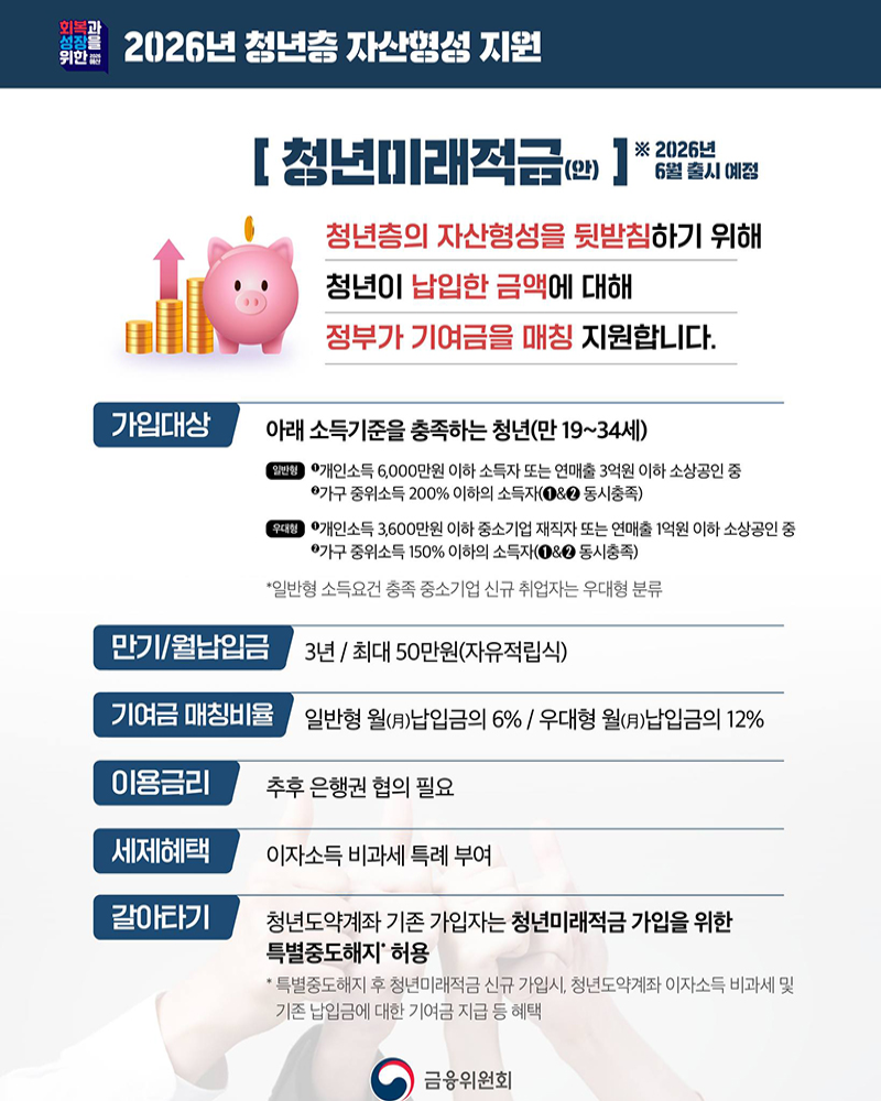 가장 핫한 소식은 청년미래적금 출시예요. 6월부터 만 19~34세 청년들이 가입할 수 있는 3년 만기 적금인데요, 기존 청년도약계좌의 단점(5년 장기)을 보완해 더 짧고 매력적으로 바뀌었어요. 월 최대 50만 원씩 넣으면 정부가 납입액의 6%에서 최대 12%까지 기여금을 더해주니, 만기 시 2,000만 원 이상 목돈이 쌓여요. 예를 들어 우대형에 풀 납입하면 2,200만 원까지 가능하답니다.