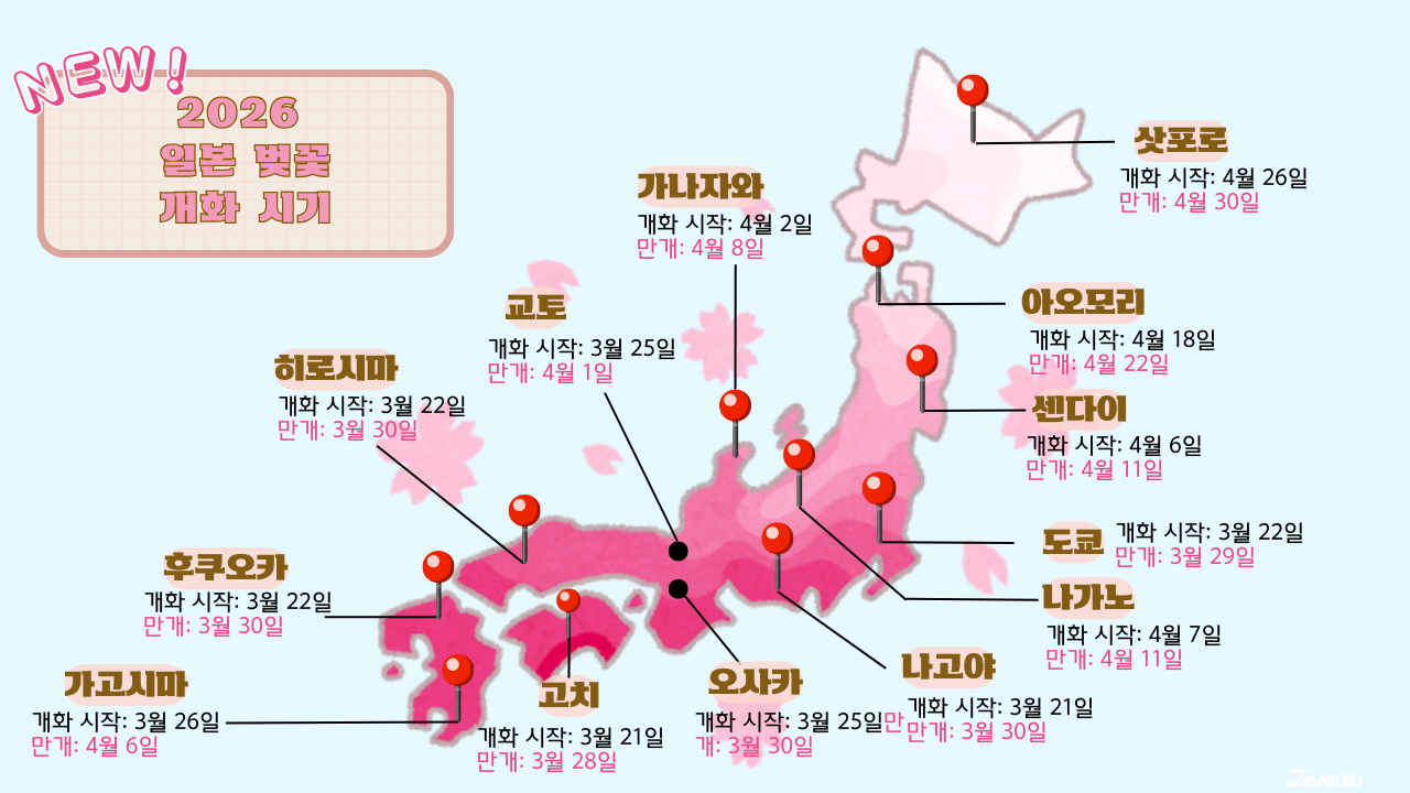 💡 정리하자면, 3월 말~4월 초에 휴가를 쓰실 수 있다면 도쿄·오사카, 3월 마지막 주말 쯤 짧게 다녀오고 싶으시다면 후쿠오카·나고야, 4월 말~5월 초에 맞춰 늦은 벚꽃을 즐기고 싶으시다면 홋카이도를 고려해 보시면 좋겠습니다.
