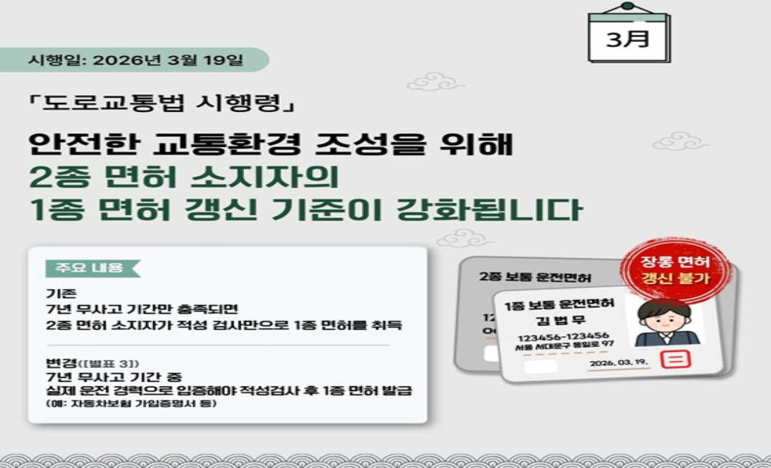 2026년부터 운전면허 제도는 꽤 많이 달라집니다. 대표적으로 면허 갱신 기한이 생일 기준으로 바뀌고, 2종에서 1종으로 전환할 때 실제 운전 경력 입증이 필요해지는 등 제도가 더 까다로워졌습니다. 여기에 물가까지 오르다 보니, 학원 등록을 앞둔 입장에서는 “이왕 따는 거, 정부 지원금·환급 받을 수 있는 건 다 챙기고 싶다”는 마음이 드실 수밖에 없습니다.